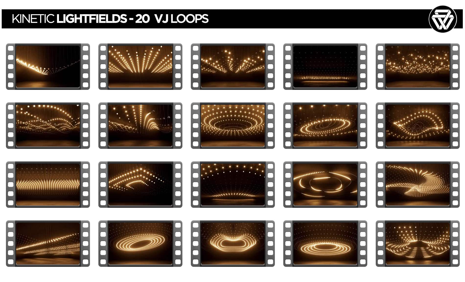 Kinetic Lightfields VJ Loops Pack features 20 motion clips inspired by kinetic light fixtures designed for immersive visual environments.